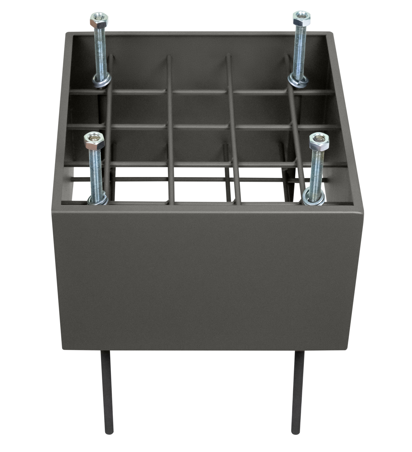 Опалубка для заливки фундамента под механический шлагбаум «MBT». Изготовлена из стали толщиной 1,5 мм. Внутри конструкция усилена калибровочным кругом (прутком) d6 мм. 4 шпильки M12 для последующего монтажа механического шлагбаума. Опалубка окрашена в цвет RAL 7022